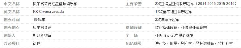 贝尔格莱德红星队成立于1945年,是前南斯拉夫以及塞尔维亚历史上最成功的球队,做为欧洲历史最悠久的篮球俱乐部之一,红星队向塞尔维亚国家队,NBA,欧洲各大篮球联赛输送了大量的人才。重视青训是红星队近年来球队发展的主要原因,最近几个赛季红星队在欧洲篮球联赛中大杀四方,称霸亚得里亚海联赛和塞尔维亚国内联赛。