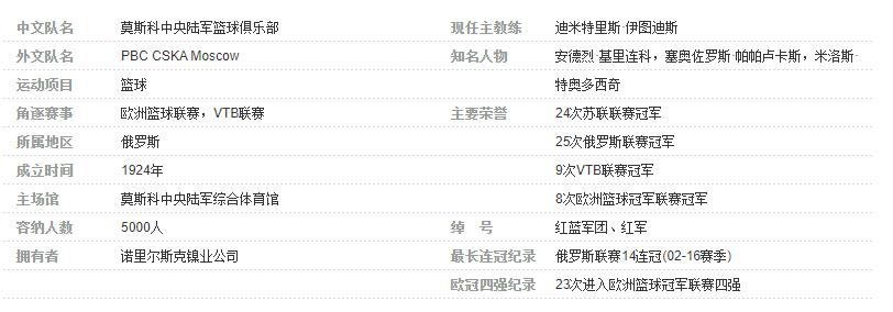 莫斯科中央陆军职业篮球俱乐部(ПБК ЦСКА Москва)是俄罗斯最著名的篮球俱乐部,也是获得苏联/俄罗斯全国冠军次数最多的俱乐部。在欧洲赛场莫斯科中央陆军获得过八次冠军,仅次于十次夺冠的西班牙皇家马德里篮球俱乐部。