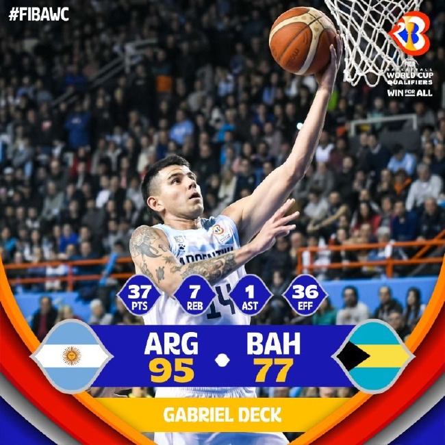 jrs直播网讯 8月30日讯 在今天结束的一场世预赛第四窗口期的比赛中,阿根廷95-77击败巴哈马。本场比赛,曾效力于雷霆的加布里埃尔-戴克表现抢眼,19投14中,砍下37分7篮板1助攻。