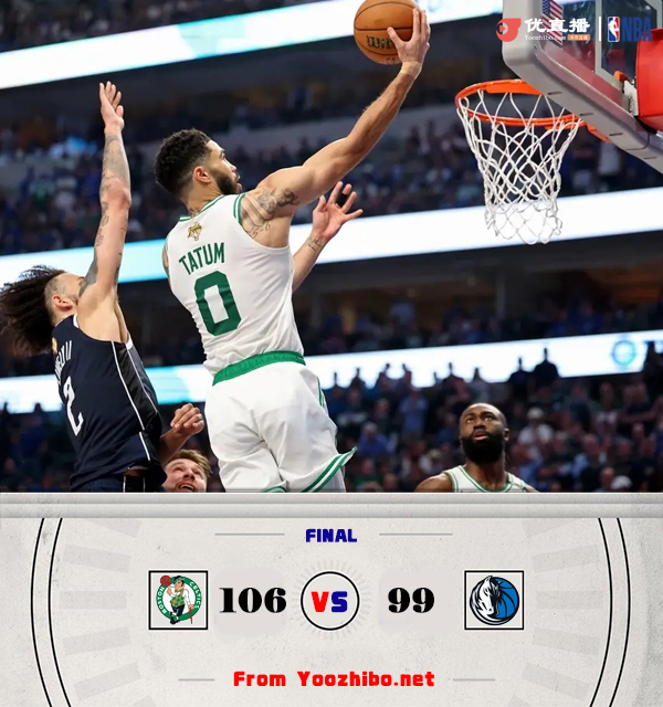 jrs直播网 6月13日讯 NBA总决赛G3,独行侠今日回到主场迎战凯尔特人,在前两场比赛中凯尔特人都是拿下胜利,大比分2-0领先,此役波尔津吉斯因脚伤缺战。比赛上来,回到主场的独行侠就迅速抢下开局打出9-2的攻势取得领先,分差此后也是拉开到了两位数,好在是凯尔特人及时调整回应一波11-0的小高潮追上比分,次节双方的命中率都出现下滑,场面也是十分胶着,半场结束时独行侠领先1分;下半场回来,独行侠的进攻表现依旧糟糕,单节只拿到19分,而杰伦-布朗则是迎来爆发,单节独得15分帮助凯尔特人取得15分的领先优势,末节上来凯尔特人又是连中两记三分将分差扩大到二十分以上,但随后独行侠就轰出22-2的攻势打回悬念,关键时刻东契奇犯满离场,布朗又是连续得分没有给对手逆转的机会,最终凯尔特人险胜独行侠,大比分3-0拿到赛点。