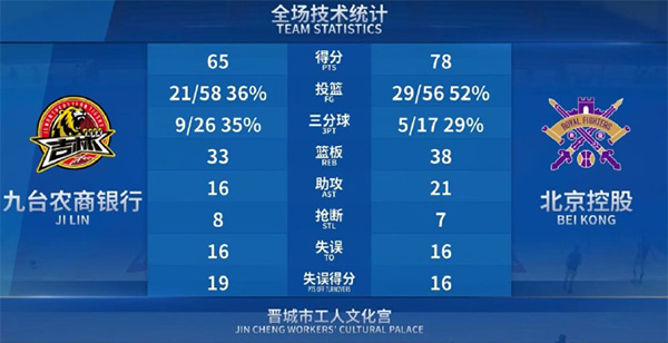 jrs直播网讯 9月20日讯 CBA季前赛山西晋城赛区,吉林对阵北控。一开场,双方势均力敌,比分交替领先,北控突然发力打出10-2的攻击波,次节吉林内外开花紧咬比分,北控连造杀伤通过罚球稳住局势,半场打完北控41-35仍有6分优势。下半场,吉林命中率下降,张帆连中三分率队将分差拉开到20分,末节吉林里突外投苦苦追赶,北控稳扎稳打将优势保持到最后。最终,北控78-65轻取吉林。