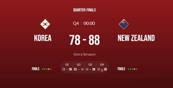 jrs直播网北京时间7月21日讯,男篮亚洲杯1/4决赛结束了最后一场较量,韩国男篮对阵新西兰男篮,最终经过四节比赛战罢,韩国男篮站着出局,球队在2名球员无法出场的情况下,本场对阵新西兰又要两人被罚下,最终78-88输给新西兰,无缘四强。