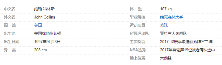 2017-18赛季,约翰·科林斯代表老鹰队出场74场,场均出场24分钟,可以得到10.5分、7.3篮板、1.3助攻和1.1盖帽。