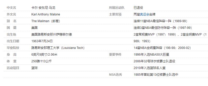 卡尔·马龙(Karl Malone),1963年7月24日出生于美国路易斯安那州萨穆菲尔德,前美国职业篮球运动员,司职大前锋,绰号“邮差”(The Mailman) 。