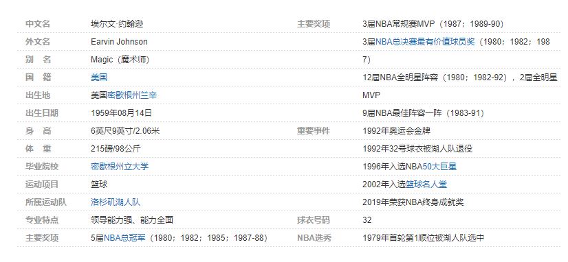 埃尔文·约翰逊(Earvin Johnson),1959年8月14日出生于美国密歇根州兰辛,前美国职业篮球运动员,教练员、解说员以及商人,司职控球后卫,绰号“魔术师”(Magic)。个人简介:
