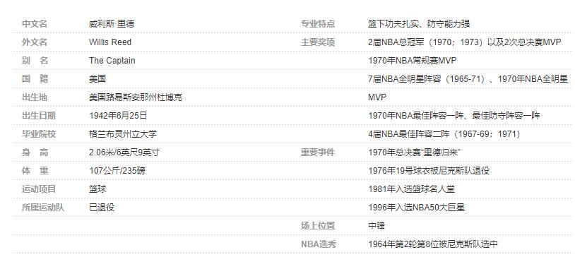 威利斯·里德(Willis Reed),1942年6月25日出生于美国路易斯安那州杜博克(Dubach,Louisiana),前美国职业篮球运动员,司职中锋/大前锋 。个人简介: