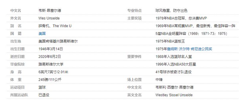 韦斯·昂塞尔德(Wes Unselde,1946年3月14日-2020年6月2日),出生于美国肯塔基州路易斯维尔,前美国职业篮球运动员,司职中锋/大前锋,绰号“碎骨机”。个人简介: