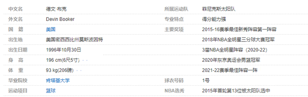 德文-布克(Devin Booker),1996年10月30日出生于美国密西西比州莫斯波因特(Moss Point, Mississippi),美国职业篮球运动员,司职得分后卫,效力于NBA菲尼克斯太阳队。