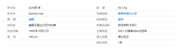 达米恩-李(Damion Lee),1992年10月21日出生于美国马里兰州巴尔的摩(Baltimore, Maryland),美国职业篮球运动员,司职得分后卫,效力于NBA菲尼克斯太阳队。达米恩-李是2016年的NBA落选秀,职业生涯先后效力于亚特兰大老鹰队、金州勇士队和菲尼克斯太阳队,2022年随勇士队夺得NBA总冠军。