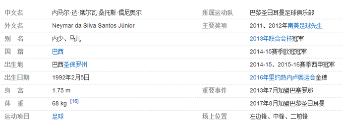 内马尔·达·席尔瓦·桑托斯·儒尼奥尔(葡萄牙语:Neymar da Silva Santos Júnior),通称内马尔(Neymar),1992年2月5日出生于巴西圣保罗州,巴西足球运动员,司职前锋,现效力于法国足球甲级联赛的巴黎圣日耳曼足球俱乐部 ,亦担任巴西国家男子足球队队长。