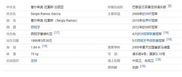 塞尔希奥·拉莫斯(Sergio Ramos),全名塞尔希奥·拉莫斯·加西亚(Sergio Ramos García),1986年3月30日出生于西班牙塞维利亚,西班牙足球运动员,司职中后卫。现效力于巴黎圣日耳曼足球俱乐部 。个人简介: