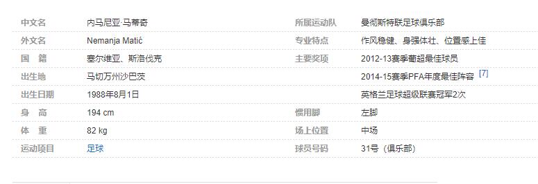 内马尼亚-马蒂奇(英语:Nemanja Matić/塞尔维亚语:Немања Матић),1988年8月1日出生于塞尔维亚马切万州沙巴茨,拥有塞尔维亚/斯洛伐克双重国籍, [1] 塞尔维亚男子职业足球运动员,司职中场,效力于英超曼彻斯特联足球俱乐部。个人简介: