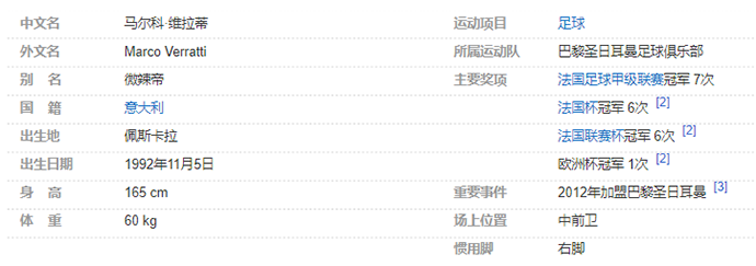 马尔科·维拉蒂(Marco Verratti),1992年11月5日出生于意大利佩斯卡拉,意大利足球运动员,场上司职中前卫,现效力于法国足球甲级联赛的巴黎圣日耳曼足球俱乐部。2008年,维拉蒂出道于佩斯卡拉。2012年7月,维拉蒂以1200万欧元的身价转会至巴黎圣日耳曼,此后随队夺得7座法甲冠军奖杯。