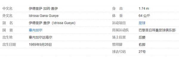 伊德里萨·盖伊(Idrissa Gueye),全名:伊德里萨·加纳·盖伊(Idrissa Gana Gueye),1989年9月26日出生于塞内加尔达喀尔,塞内加尔足球运动员,司职后腰,现效力于法国足球甲级联赛的巴黎圣日耳曼足球俱乐部。2018年6月6日,塞内加尔公布了参加2018年俄罗斯世界杯23人大名单,伊德里萨·盖伊入选。