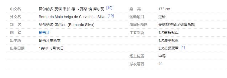 贝尔纳多·席尔瓦(Bernardo Silva),全名:贝尔纳多·莫塔·韦加·德·卡瓦略·埃·席尔瓦(Bernardo Mota Veiga de Carvalho e Silva),1994年8月10日出生于葡萄牙里斯本,葡萄牙足球运动员,司职中场,效力于英超曼彻斯特城足球俱乐部。个人简介: