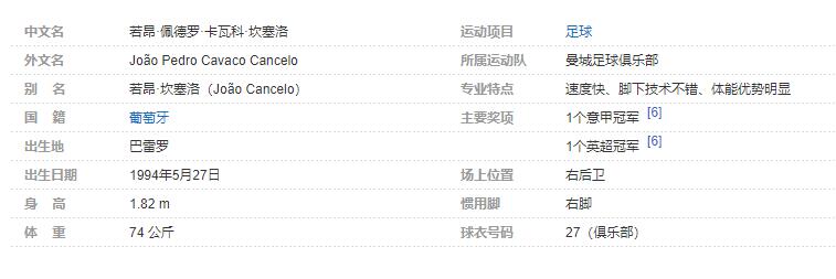 若昂·坎塞洛(João Cancelo),全名:若昂·佩德罗·卡瓦科·坎塞洛(João Pedro Cavaco Cancelo),1994年5月27日出生于葡萄牙巴雷罗,葡萄牙足球运动员,司职右后卫,现效力于英格兰足球超级联赛的曼彻斯特城足球俱乐部。