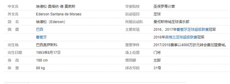 埃德松(Ederson)(Ederson的葡萄牙语发音译名是埃德松),全名:埃德松·桑塔纳·德·莫赖斯(Ederson Santana de Moraes),1993年8月17日出生于巴西奥萨斯科,巴西足球运动员,司职门将,现效力于英格兰足球超级联赛的曼彻斯特城足球俱乐部。 个人简介: