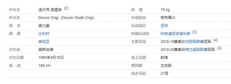 迪沃克·奥里吉(Divock Origi),1995年4月18日出生于比利时奥斯坦德,拥有比利时/肯尼亚双重国籍,比利时职业足球运动员,场上司职前锋。效力于英超的利物浦足球俱乐部。个人简介: