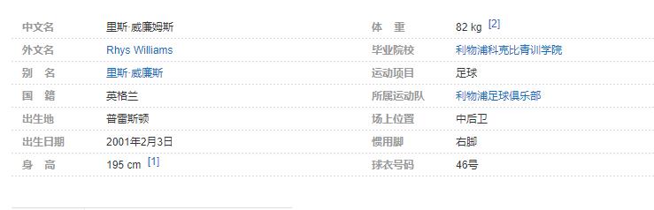 里斯·威廉姆斯(Rhys Williams),2001年2月3日出生于英格兰普雷斯顿,英格兰足球运动员,场上司职中后卫,现效力于英格兰足球超级联赛的利物浦足球俱乐部。个人简介: