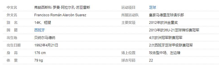 弗朗西斯科·罗曼·阿拉尔孔·苏亚雷斯(Francisco Román Alarcón Suarez),昵称伊斯科(Isco),1992年4月21日出生于西班牙的贝纳尔马德纳,西班牙足球运动员,场上司职前腰,现效力于西班牙足球甲级联赛的皇家马德里足球俱乐部。个人简介