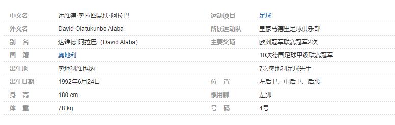 达维德·阿拉巴(David Alaba),全名达维德·奥拉图昆博·阿拉巴(David Olatukunbo Alaba),1992年6月24日出生于奥地利维也纳,奥地利足球运动员,场上司职左后卫,现效力于西班牙足球甲级联赛的皇家马德里足球俱乐部。