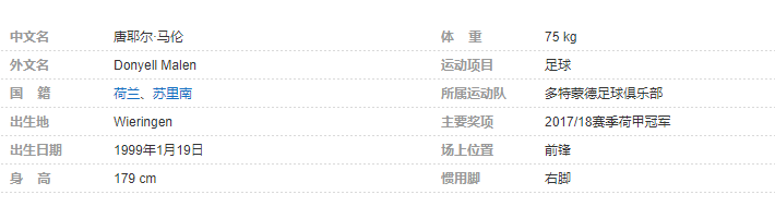 唐耶尔·马伦(Donyell Malen),1999年1月19日出生于荷兰,荷兰男子足球运动员。场上司职前锋,效力于德国的多特蒙德足球俱乐部。个人简介