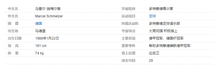 马塞尔·施梅尔策(Marcel Schmelzer),1988年1月22日出生于德国马德堡,德国职业足球运动员,场上司职边后卫,现效力于德国足球甲级联赛的多特蒙德足球俱乐部。个人简介