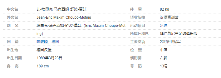 埃里克·马克西姆·舒波-莫廷(Eric Maxim Choupo-Moting),全名让-埃里克·马克西姆·舒波-莫廷(Jean-Eric Maxim Choupo-Moting),1989年3月23日出生于德国汉堡,喀麦隆职业足球运动员,司职中锋,现效力于德国足球甲级联赛的拜仁慕尼黑足球俱乐部。