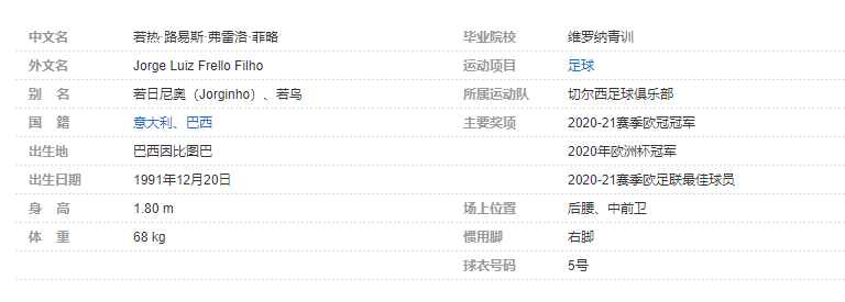 若日尼奥(Jorginho),全名若热·路易斯·弗雷洛·菲略(Jorge Luiz Frello Filho),1991年12月20日出生于巴西因比图巴,意大利足球运动员,司职后腰,现效力于英格兰足球超级联赛的切尔西足球俱乐部 。个人简介