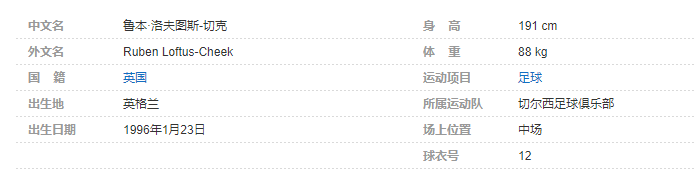 鲁本·洛夫图斯-切克(Ruben Loftus-Cheek),生于1996年1月23日,英格兰职业足球运动员,司职中场,曾效力于英超的切尔西足球俱乐部,2017年租借效力于英格兰超级联赛的水晶宫足球俱乐部 ,现租借于英格兰超级联赛的富勒姆足球俱乐部 。个人简介