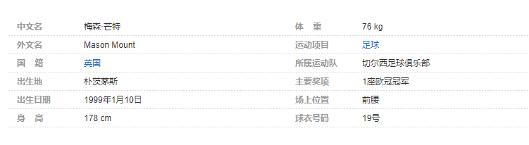 梅森·芒特(Mason Mount),1999年1月10日出生于英国朴茨茅斯市,英格兰职业足球运动员,场上司职前腰,现效力于英格兰足球超级联赛的切尔西足球俱乐部 。个人简介