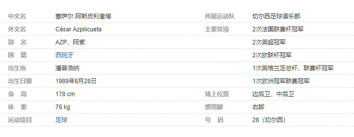 塞萨尔·阿斯皮利奎塔(César Azpilicueta),全名塞萨尔·阿斯皮利奎塔·坦科(César Azpilicueta Tanco),1989年8月28日出生于西班牙潘普洛纳,西班牙足球运动员,司职边后卫,亦可兼任中后卫,现效力于英超切尔西足球俱乐部,并于2019-20赛季开始担任球队队长 。个人简介