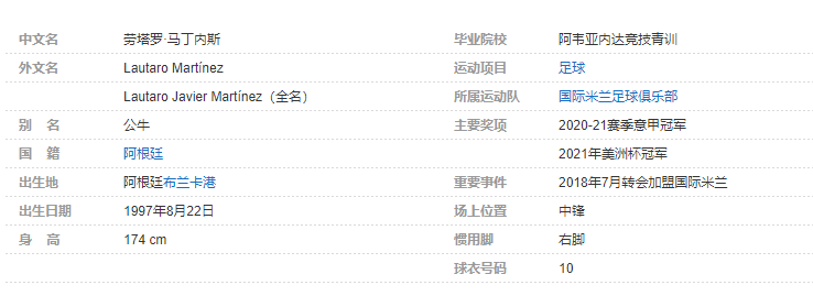 劳塔罗·马丁内斯(Lautaro Martínez),全名劳塔罗·哈维尔·马丁内斯(Lautaro Javier Martínez),1997年8月22日出生于阿根廷布兰卡港,阿根廷足球运动员,场上司职中锋,现效力于意大利足球甲级联赛的国际米兰足球俱乐部。
