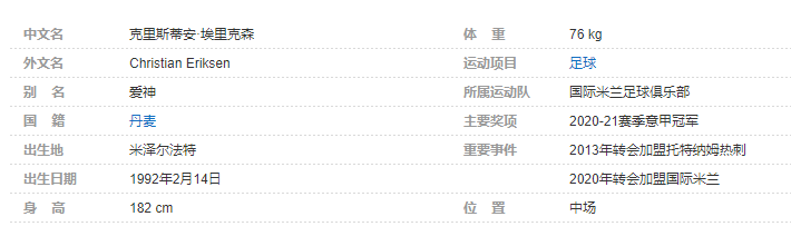 克里斯蒂安·埃里克森(Christian Eriksen),1992年2月14日出生于丹麦米泽尔法特,丹麦足球运动员,场上司职中场,效力于意甲国际米兰足球俱乐部 。个人简介