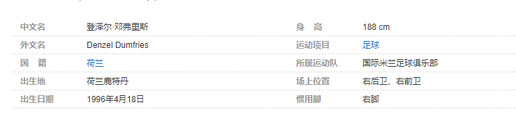 登泽尔·邓弗里斯(Denzel Dumfries),全名登泽尔·于斯特斯·莫里斯·邓弗里斯(Denzel Justus Morris Dumfries),1996年4月18日出生于荷兰鹿特丹,荷兰足球运动员,司职右后卫,现效力于意大利足球甲级联赛的国际米兰足球俱乐部 。2021年8月,邓弗里斯加盟国际米兰 。个人简介