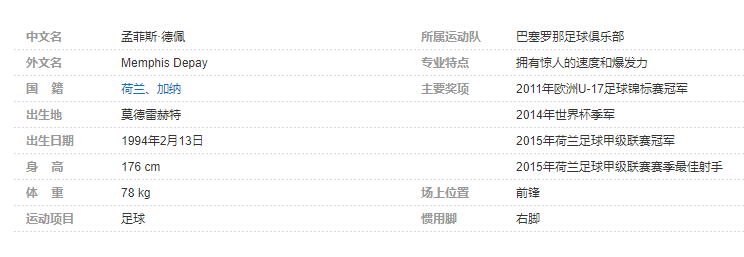孟菲斯·德佩(Memphis Depay),1994年2月13日出生于荷兰莫德雷赫特,荷兰足球运动员,拥有荷兰和加纳双重国籍,荷兰足球运动员,场上司职前锋,现效力于西班牙足球甲级联赛的巴塞罗那足球俱乐部。个人简介