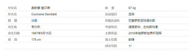 奥斯曼·登贝莱(Ousmane Dembélé),1997年5月15日出生于法国韦尔农,法国足球运动员,场上司职前锋,现效力于西班牙足球甲级联赛的巴塞罗那足球俱乐部。个人简介