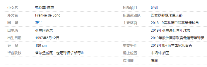 弗伦基·德容(Frenkie de Jong),1997年5月12日出生于荷兰阿克尔,荷兰男子职业足球运动员,场上司职中场/中后卫,效力于西甲巴塞罗那足球俱乐部。个人简介
