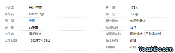 丹尼·英斯(Danny Ings),1992年7月23日出生于英格兰温彻斯特,英格兰足球运动员,场上司职前锋,现效力于英超的阿斯顿维拉足球俱乐部。