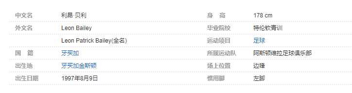 利昂·贝利(Leon Bailey [1] ),1997年8月9日出生于牙买加金斯顿,牙买加足球运动员,场上司职边锋,现效力于英格兰足球超级级联赛的阿斯顿维拉足球俱乐部。个人简介