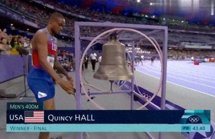 他先是超越了利差则,随后在霍姆康力竭的情况下,也完成了超越。面对最后一个对手史密斯,霍尔一鼓作气,在最后1米完成逆转。43秒40,霍尔领先史密斯0.04秒最终夺得金牌。获胜一刻,霍尔也是非常激动。他直接躺在地上接受全场观众的欢呼。随后,他来到钟的旁边,拉响铃铛庆祝。