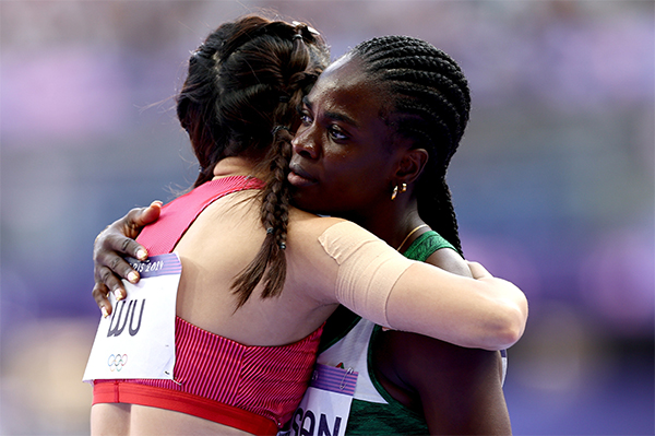 赛后,吴艳妮与隔壁道次的世界纪录保持者托比-阿穆桑拥抱致意,托比-阿穆桑在第一组第9道出战,跑出12秒49小组第一晋级半决赛,目前该项目世界纪录12秒12就是由她保持的。