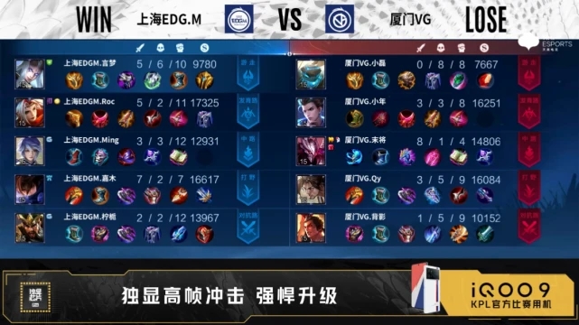 开局双方正常抢线。1分38秒中路上海EDG.M击杀兰陵王,拿下一血,双方打出1换1。3分05秒上海EDG.M拿下暴君,河道击杀沈梦溪,打出0换1。4分17秒野区上海EDG.M击杀兰陵王。5分24秒河道团战上海EDG.M娜可露露二连击破,打出1换2,摧毁敌方发育路外塔。6分23秒上海EDG.M拿下主宰。7分11秒发育路上海EDG.M打出1换1,摧毁敌方发育路二塔、中路外塔。8分59秒上海EDG.M拿下暴君,野区团战上海EDG.M击杀兰陵王,打出0换1,摧毁敌方对抗路外塔,拿下暗影主宰。10分26秒厦门VG摧毁敌方发育路外塔,上海EDG.M摧毁敌方对抗路二塔。11分06秒发育路上海EDG.M击杀李元芳,摧毁敌方发育路高地,打出1换2,摧毁水晶拿下比赛。