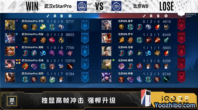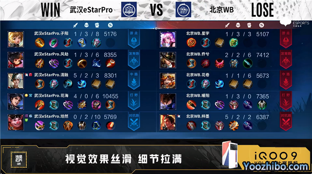 双方常规开局,1分03秒北京WB马可波罗发育路单杀李元芳拿到一血。1分57秒武汉eStar对抗路打出0换2。2分32秒暴君处团战北京WB打出1换2。3分31秒武汉eStar拿下暴君。4分40秒北京WB发育路击杀嬴政。5分17秒武汉eStar拿下主宰。5分53秒对抗路团战北京WB打出0换2。6分44秒主宰处团战北京WB打出0换2。8分05秒野区团战武汉eStar打出1换2。9分11秒武汉eStar主宰处击杀瑶。9分38秒武汉eStar拿下主宰。10分15秒武汉eStar拿下暗影暴君。11分15秒武汉eStar摧毁敌方对抗路二塔。11分50秒野区团战武汉eStar打出1换5。12分28秒武汉eStar摧毁敌方水晶拿下比赛。
