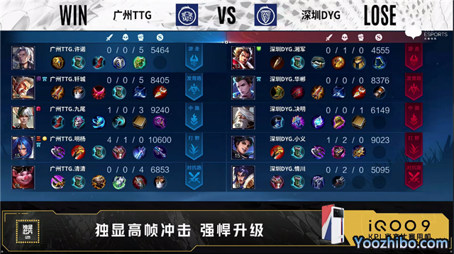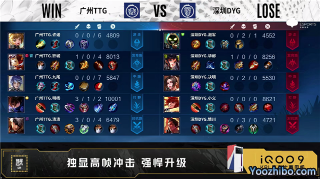 开局深圳DYG中路、对抗路换线。4分52秒广州TTG拿下暴君,深圳DYG随后拿下先知主宰。5分36秒广州TTG摧毁敌方发育路外塔。5分48秒中路团广州TTG打出0换3。6分15秒广州TTG摧毁敌方中路外塔。7分17秒广州TTG先后摧毁敌方对抗路外、二塔。9分30秒广州TTG摧毁敌方发育路二塔。9分40秒广州TTG野区击杀吕布。10分13秒广州TTG拿下暗影主宰。10分50秒中路团广州TTG打出0换2。11分16秒广州TTG摧毁敌方对抗路高地塔。11分30秒广州TTG摧毁水晶拿下比赛。