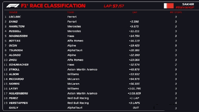 2022F1巴林大奖赛第正赛成绩表: