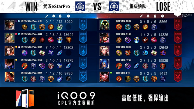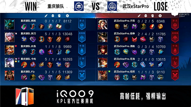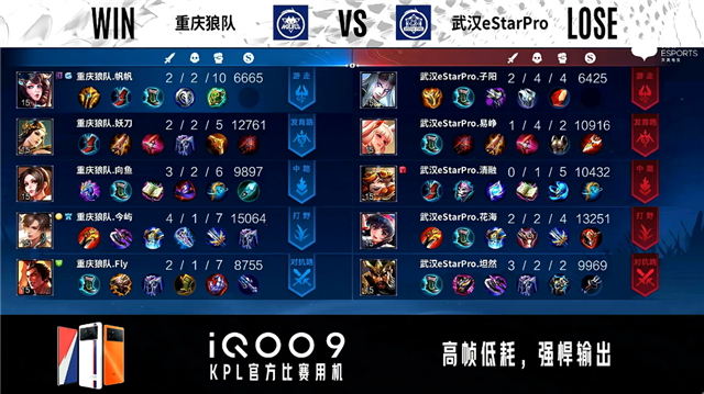 开局武汉eStar中路、发育路换线。3分48秒武汉eStar拿下主宰。5分18秒武汉eStar摧毁敌方对抗路外塔。5分34秒重庆狼队发育路击杀云缨拿到一血。7分32秒重庆狼队对抗路击杀马可波罗。8分17秒重庆狼队拿下主宰。9分34秒武汉eStar中路击杀墨子。10分55秒主宰处团战重庆狼队打出2换4。11分18秒重庆狼队摧毁敌方对抗路二塔。12分16秒重庆狼队镜发育路单杀云缨。12分27秒重庆狼队中路击杀周瑜。12分48秒重庆狼队摧毁敌方中路高地塔。14分43秒武汉eStar发育路击杀百里守约。15分27秒武汉eStar拿下暗影主宰。15分34秒武汉eStar野区击杀镜。16分39秒重庆狼队镜对抗路单杀云缨。18分18秒中路团战重庆狼队击杀张飞。18分50秒高地团战重庆狼队打出0换3摧毁水晶拿下比赛。