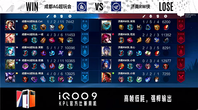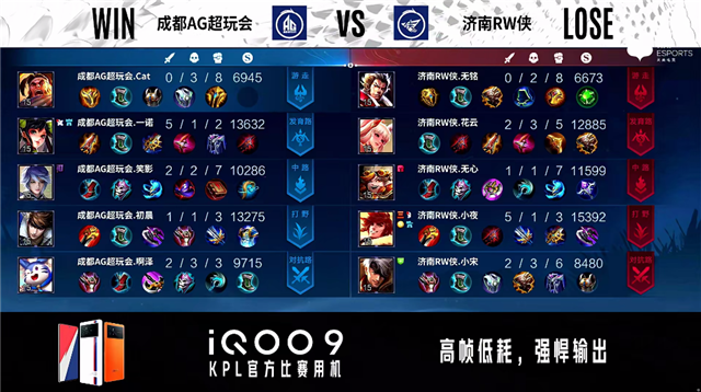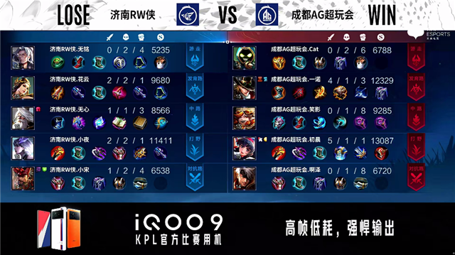 2分40秒,济南RW侠裴擒虎越塔击杀梦奇拿下一血。3分44秒,济南RW侠控下暴君。4分10秒,成都AG超玩会击杀公孙离。4分38秒,成都AG超玩会破掉济南RW侠下一塔。5分15秒,双方团,济南RW侠打出1换2。6分38秒,成都AG超玩会赵云上路蹲伏单杀公孙离。6分54秒,成都AG超玩会控下先知主宰并破掉济南RW侠上一塔。7分24秒,成都AG超玩会下路击杀夏侯惇。9分04秒,成都AG超玩会小兵摧毁济南RW侠下二塔。9分50秒,济南RW侠集火秒掉梦奇。10分18秒,济南RW侠中路击杀苏烈,随后成都AG超玩会赵云偷掉济南RW侠下高地。11分25秒,成都AG超玩会击杀夏侯惇。11分40秒,济南RW侠控下暗影暴君,随后成都AG超玩会控下暗影主宰并破掉济南RW侠上二塔。12分41秒,成都AG超玩会破掉济南RW侠中一塔,随后团战济南RW侠打出0换5团灭对手,裴擒虎拿下三杀。15分28秒,济南RW侠控下暗影暴君。16分15秒,济南RW侠控下暗影主宰。18分10秒,双方团,成都AG超玩会打出0换3。18分48秒,成都AG超玩会一波摧毁济南RW侠水晶赢下比赛。