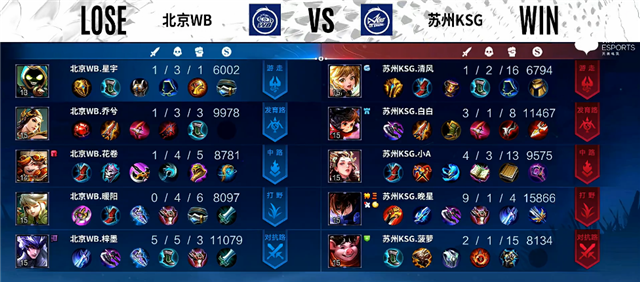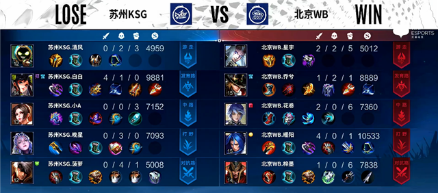 1分钟苏州KSG入侵野区,马超拿下一血,团战苏州KSG打出3换2。3分钟澜拿下暴君。4分钟中路团战,双方1换1。4分30秒杨玉环被击杀。6分钟阿古朵拿下主宰。6分32秒中路团战,苏州KSG打出1换2。7分30秒澜拿下暴君。8分10秒野区团战,苏州KSG打出0换3。9分钟李元芳推掉中路一塔。9分17秒野区团战,双方2换2。10分25秒澜拿下暴君。11分钟澜拿下主宰。14分30秒苏州KSG推掉中路高地塔,团战打出0换2。15分钟苏州KSG团灭北京WB推掉水晶追回一分。