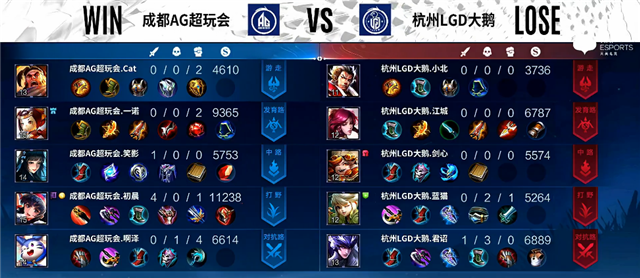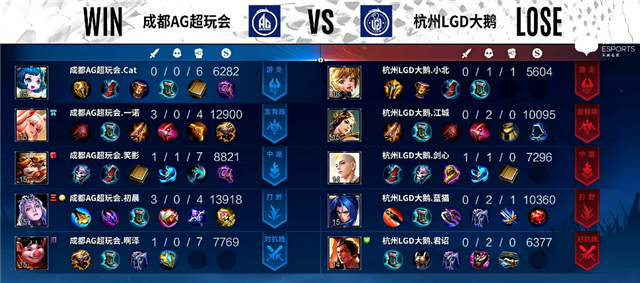 双方和平开局。2分27秒赵云拿下暴君,娜可露露拿下主宰。5分10秒成都AG超玩会上路一塔被破。6分17秒成都AG超玩会下路一塔被破。6分30秒野区团战,赵云拿下一血。7分钟赵云拿下暴君。7分40秒赵云被击杀。7分57秒娜可露露拿下主宰。8分45秒中路团战,成都AG超玩会打出1换3,孙尚香拿下三杀。9分15秒孙尚香推掉中路一塔。10分22秒赵云拿下主宰。12分钟赵云推掉上路高地塔,夏侯惇被击杀。13分钟孙尚香拿下暴君。14分钟赵云拿下主宰。14分25秒赵云推掉中路高地塔。14分41秒成都AG超玩会推掉水晶拿下本场比赛胜利。